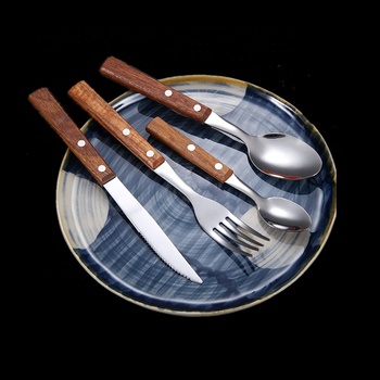 Paslanmaz çelik 18/8 sofra takımı seti ahşap saplı lazer logosu iş hediyeler için çatal bıçak çatal kaşık